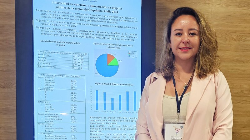 En la oportunidad, la Directora del Departamento de Formación Transversal en Salud de La U. Central Región de Coquimbo, Ximena Fernández, presentó un póster de su investigación en el marco de su doctorado en salud pública. Su estudio titulado "Literacidad en nutrición y alimentación en mujeres de la cuarta región 2024" abordó la importancia de la educación nutricional en este sector de la población, resaltando la necesidad de promover habilidades y conocimientos que permitan tomar decisiones informadas sobre la alimentación.
