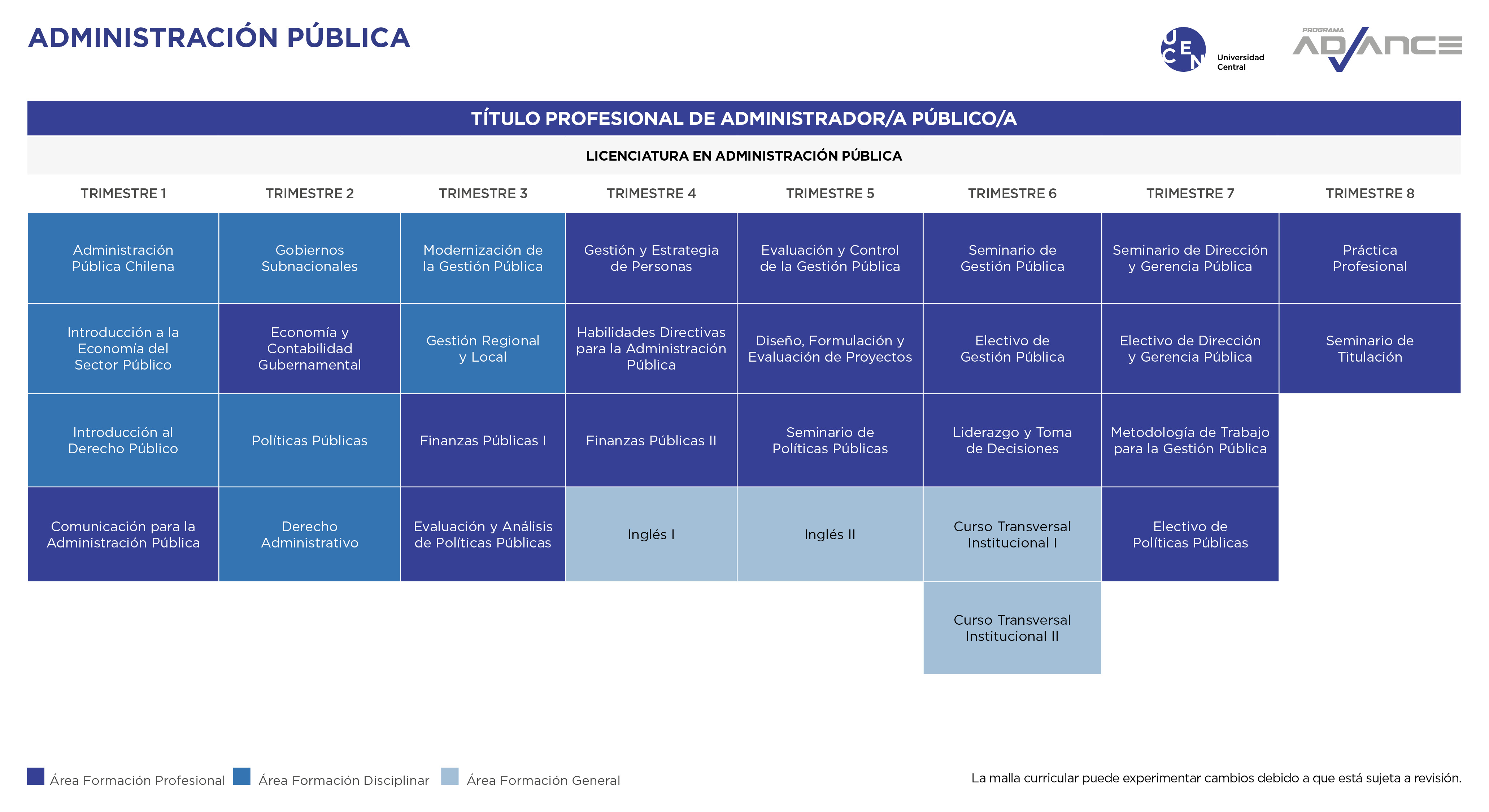 El programa Advance Administración Pública de la UCEN, te transforma en un profesional comprometido, que sirve al país desde una perspectiva crítica, ética y de excelencia, destacándose por un conocimiento íntegro de la gestión y de las políticas públicas, así como por su capacidad para formar parte de equipos directivos de instituciones públicas a nivel nacional y subnacional. Sabe desempeñarse como gestor de procesos administrativos en contextos dinámicos y complejos, con dominio de las políticas públicas y como asesor eficiente y eficaz en la toma de decisiones al interior de las organizaciones públicas.