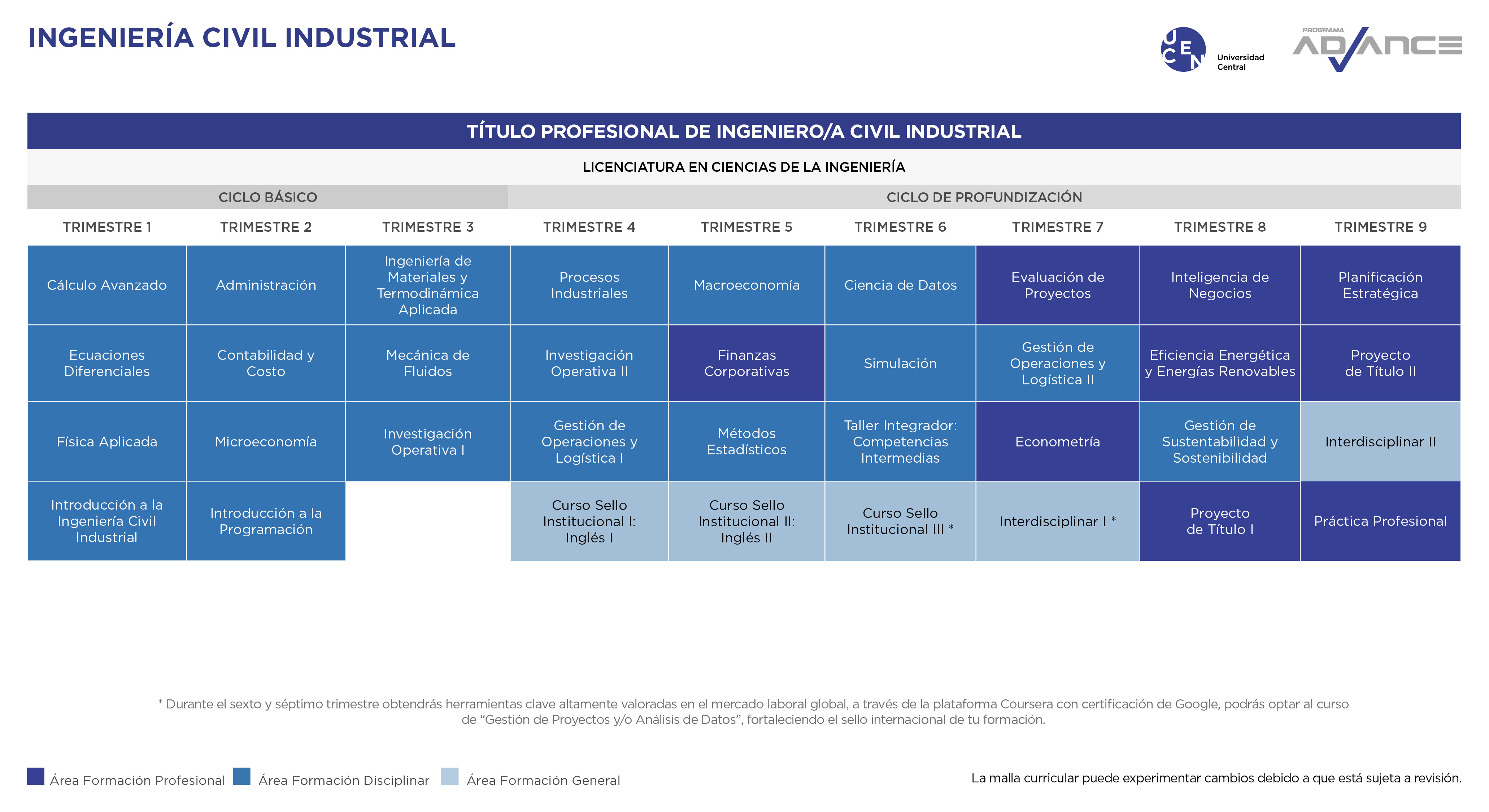 El programa Advance Ingeniería Civil Industrial de la UCEN, te transforma en un profesional capaz de asumir un rol activo en diversas organizaciones o iniciativas propias de negocio, contribuyendo como agente de cambio en la gestión organizacional y gestión de producción y operaciones a través de la innovación e integración tecnológica, para el desarrollo sostenible de las mismas, dentro de un contexto de globalización y competitividad.