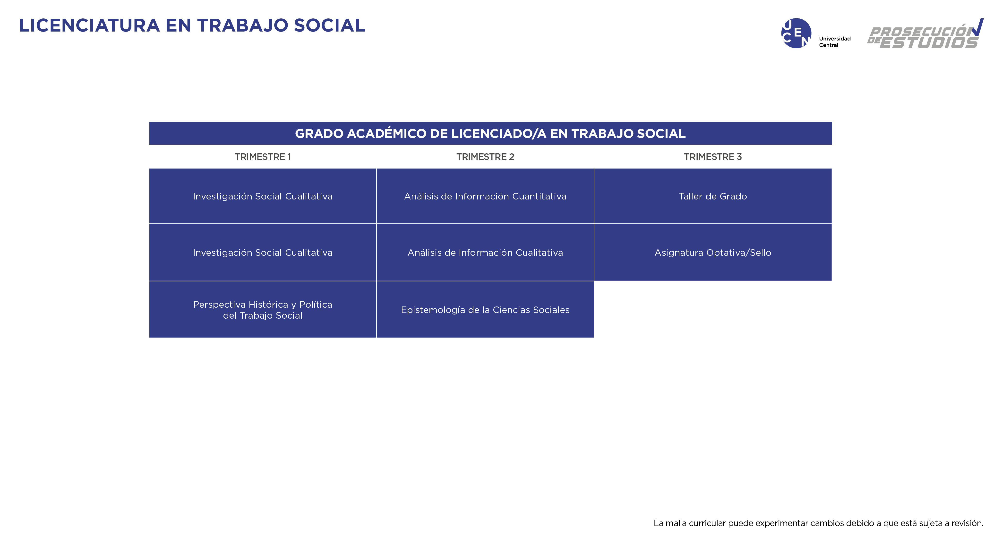 Los(as) Licenciados(as) en Trabajo Social de la Universidad Central de Chile poseen competencias para desempeñarse en el ámbito de la investigación social con una perspectiva ética, reflexiva y crítica. En su ejercicio como licenciados(as), impactan positivamente el la sociedad a través de un enfoque de derechos y respeto a la dignidad de las personas, comunicando de manera clara, adecuada y pertinente información relevante para las personas y comunidades, según propósitos, audiencias y contextos. Implementan metodologías investigativas que contribuyen en la ejecución de una intervención social, desde un enfoque crítico, reflexivo, situado, investigando desde una perspectiva propia del Trabajo Social, para lo cual utilizan metodologías y técnicas rigurosas de registro y análisis de información cuantitativa y cualitativa.