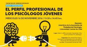 La Escuela de Psicología y Asociación de Egresados de la Escuela de Psicología de la Facultad de Ciencias Sociales de la Universidad Central realizarán el miércoles 16 de noviembre 2016 la mesa redonda "El perfil profesional de los psicólogos jóvenes".