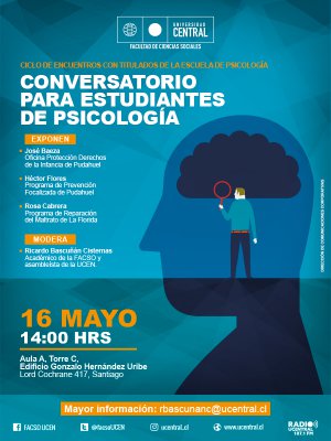 El miércoles 16 de mayo se realizará en la Universidad Central el tercer módulo del Ciclo de Encuentros con titulados de la Escuela de Psicología, organizado por el académico de la FACSO y asambleísta de la U. Central, Ricardo Bascuñán Cisternas.