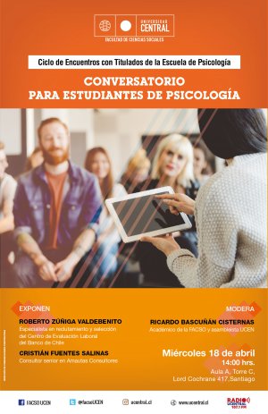 El miércoles 18 de abril se realizará el Segundo Conversatorio con Titulados de la Escuela de Psicología de la UCEN, en la que ex alumnos o alumnas de las diferentes menciones de la Escuela de Psicología, exponen sus experiencias y las competencias laborales que sus actuales entornos demandan.