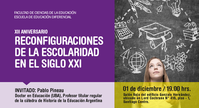 La carrera de Pedagogía en Educación Diferencial de la Facultad de Ciencias de la Educación, dentro del marco de sus actividades por su aniversario XII realizó la Charla Magistral: "Reconfiguraciones de la escolaridad en el siglo XXI" dictada por el profesor Pineau para estudiantes del Programa de II Titulación y egresados de la escuela.