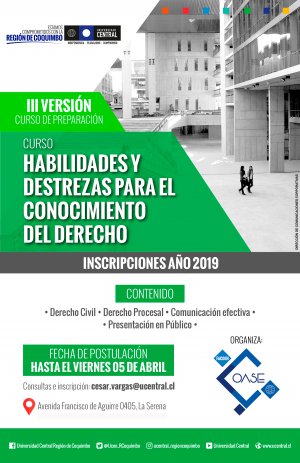 La carrera de Derecho de la Universidad Central Región de Coquimbo informa que ya se encuentran abiertas las preinscripciones para realizar el curso de "habilidades y destrezas para el conocimiento del Derecho". El inicio del curso es a finales del mes de Abril, teniendo fecha de término a finales de Octubre.