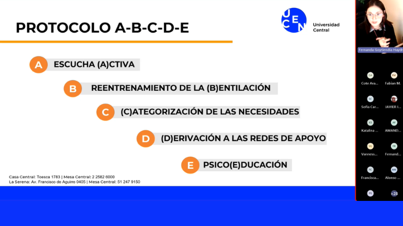 La Dirección de Apoyo y Vida Estudiantil (DAVE) ha realizado una nueva edición del taller sobre estrategias de Primeros Auxilios Psicológicos (PAP), el cual estuvo abierto a toda la comunidad centralina de la sede Santiago. En esta ocasión, y en respuesta a las necesidades de horario y formato de los estudiantes vespertinos, el taller se llevó a cabo de manera remota a través de Microsoft Teams, con la participación de 53 personas.