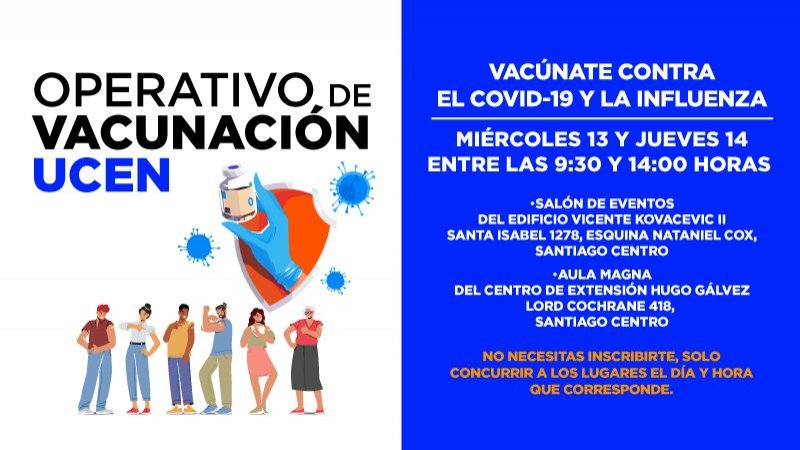 La UCEN dispondrá de dos lugares para realizar la iniciativa, el Aula Magna Fundadores del Centro de Extensión Hugo Gálvez Gajardo y el Salón de Eventos del edificio Vicente Kovacevic II. El beneficio está contemplado para las y los estudiantes, académicos y funcionarios, quienes no requieren de inscripción para ser vacunados, solo asistir a uno de los dos puntos en los horarios y días señalados.