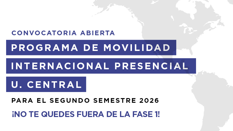 La Dirección de Relaciones Internacionales (DRI) de la Universidad Central de Chile (U. Central) invita a estudiantes de pregrado o posgrado a participar de la convocatoria para el proceso de Movilidad Internacional para el segundo semestre 2026 en alguna de las instituciones internacionales socias con convenio de colaboración académica vigente.