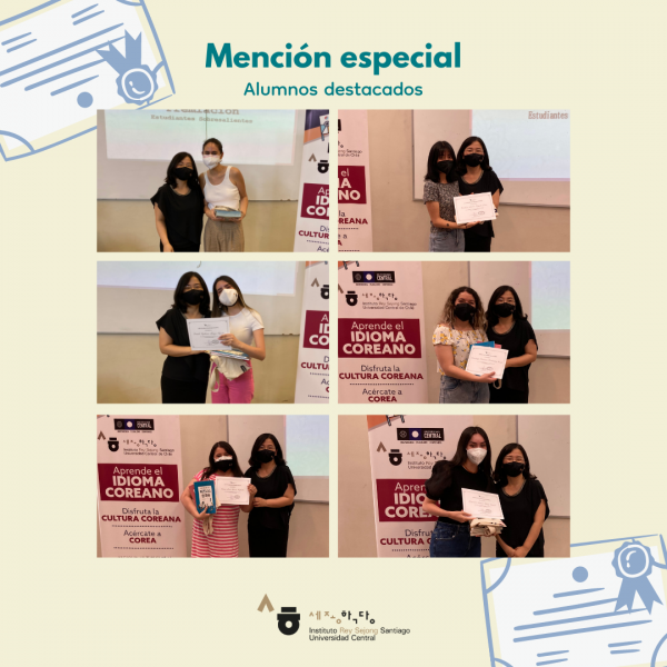 Durante la actividad, los y las estudiantes recibieron sus certificados de aprobación, además del libro “Hwaiting: Palabras Intraducibles de la Lengua Coreana” como regalo de finalización. También se premió a un estudiante sobresaliente por nivel quienes recibieron como premios distintos libros de aprendizaje del idioma, además de un certificado de reconocimiento. Por otra parte, se hizo entrega del premio, una Galaxy Tab S7, enviado directamente por la Fundación Instituto Rey Sejong, para los primeros lugares del Concurso de Oratoria y de Escritura en Coreano realizado en julio de 2021. Para finalizar la actividad, los estudiantes compartieron cuál ha sido el impacto en su vida y los cambios que han notado al estudiar el idioma y la cultura de Corea.