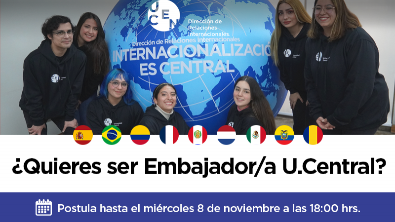La Dirección de Relaciones Internacionales invita a estudiantes de pregrado a convertirse en Embajadores UCENTRAL siendo parte del Grupo de Estudiantes que nos apoyan en acompañar y guiar a los alumnos y las alumnas internacionales que se encuentran actualmente en intercambio en nuestra Universidad, así como también a quienes visitarán la Universidad durante el primer semestre 2024-01. Si te interesa realizar un intercambio durante tu carrera académica, podrás considerar esto como un primer acercamiento a una experiencia internacional e intercultural.