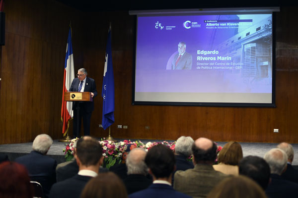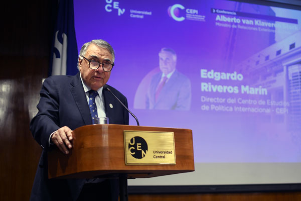 Posteriormente, el director del CEPI, Edgardo Riveros Marín, agradeció la presencia de autoridades universitarias, embajadores, académicos y estudiantes. «Debo agradecer el apoyo que nos brinda la Facultad de Derecho y Humanidades, así como la presencia de embajadores acreditados, exembajadores de Chile y, muy particularmente, la de alumnos y alumnas», señaló, destacando la participación de estudiantes de Ciencia Política de la Universidad de Santiago de Chile.