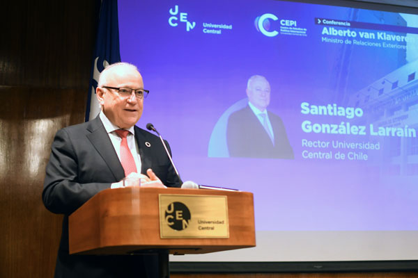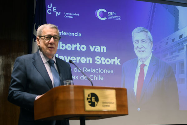 La política exterior chilena y los desafíos de un escenario internacional convulso marcaron la conferencia ofrecida por el ministro de Relaciones Exteriores, Alberto van Klaveren Stork, en la Universidad Central de Chile (UCEN). La actividad, organizada por el recién creado Centro de Estudios de Política Internacional (CEPI), congregó el lunes 1 de septiembre en el aula magna Fundadores a autoridades universitarias, representantes diplomáticos, académicos y estudiantes, en un espacio concebido para fortalecer el análisis crítico y el vínculo entre la academia y la política internacional.