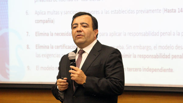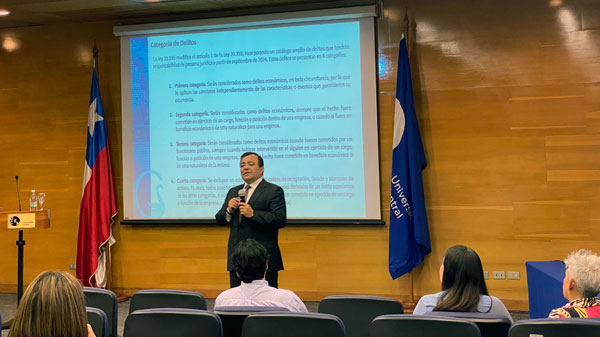 Informó que, desde la entrada en vigencia de esta ley, todas las instituciones del país pasaron a tener responsabilidad penal de la persona jurídica, «lo que significa que la persona que comete un delito es penalmente responsable como persona natural, pero esa responsabilidad se va a extender a toda la línea de supervisión y a la Universidad, si es que no se aplicaron las medidas de control y supervisión adecuadas, por lo que la responsabilidad no queda solo radicada en aquella persona que se saltó los procedimientos y cometió el delito, sino que le está traspasando la responsabilidad de control, de proteger o evitar delitos a las organizaciones».