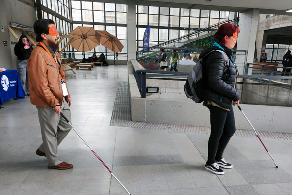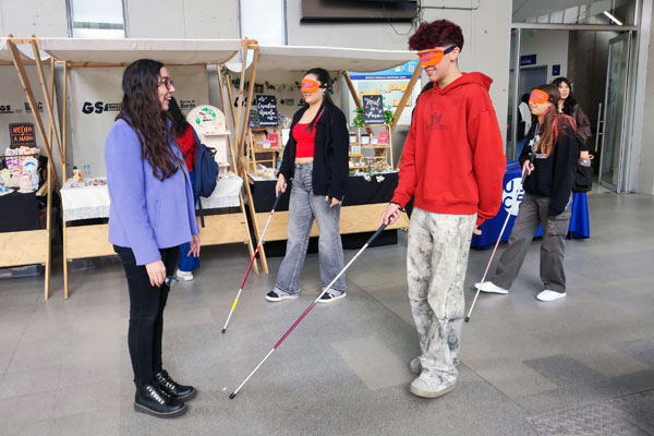 Por su parte, Pía Muñoz, profesora diferencial especialista en discapacidad visual, comentó: «El 15 de octubre celebramos el Día del Bastón Blanco, que simboliza autonomía e independencia para las personas en situación de discapacidad visual. Quisimos conmemorarlo con la actividad “Ponte en mi lugar”, donde muchos estudiantes se animaron a participar y aprender sobre el uso del bastón y las técnicas de orientación y movilidad. Fue una experiencia muy enriquecedora y participativa; además, contamos con el apoyo de las estudiantes de Trabajo Social, que ayudaron a difundir material educativo y a sensibilizar a la comunidad universitaria».