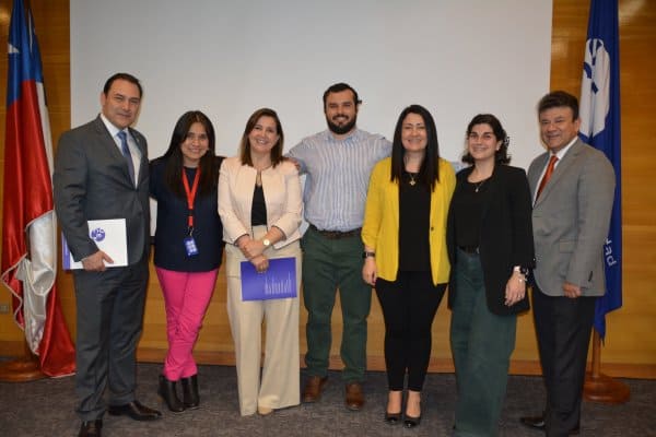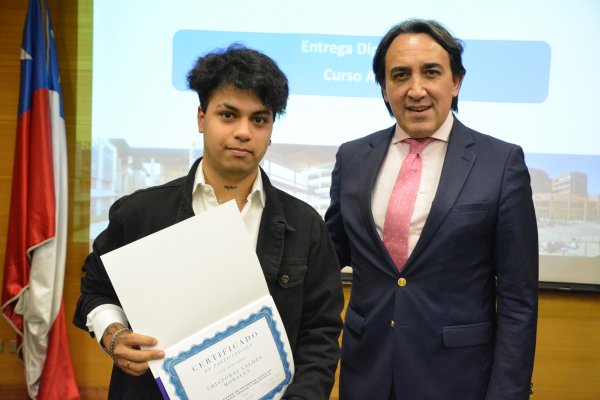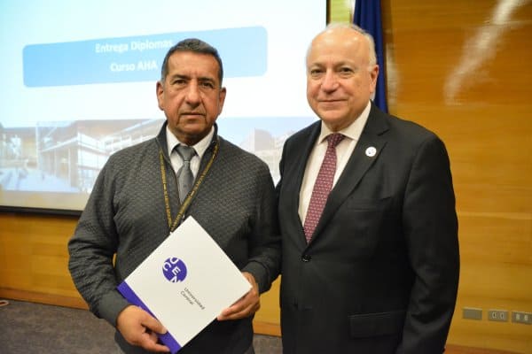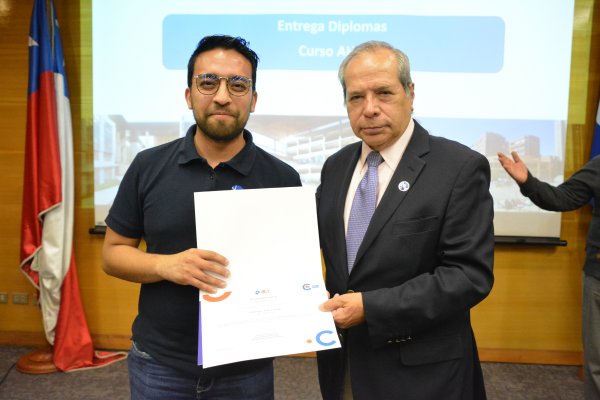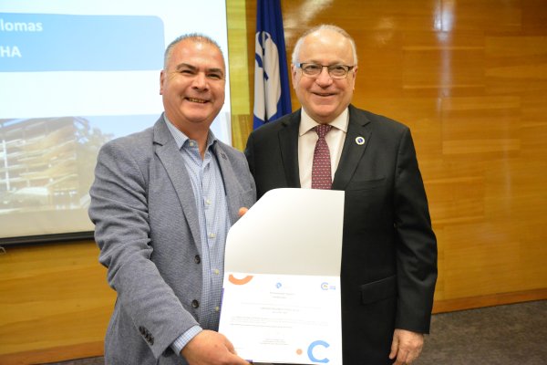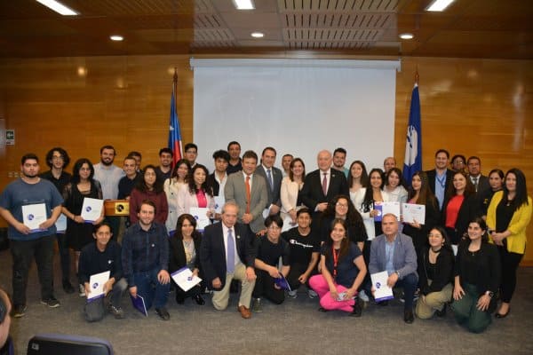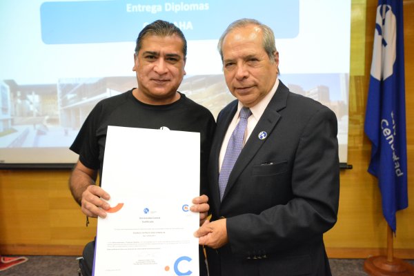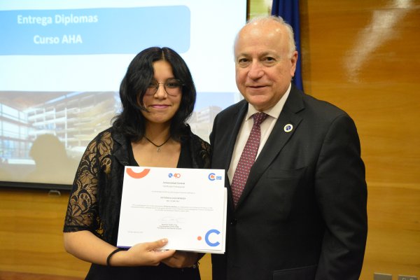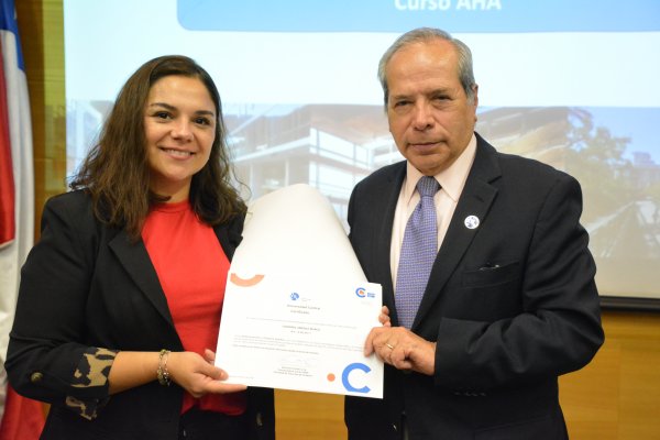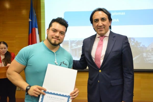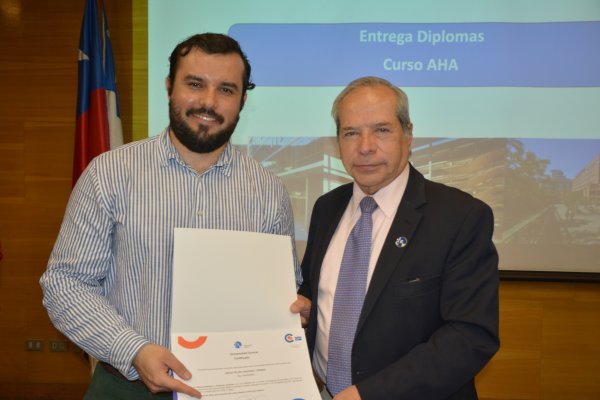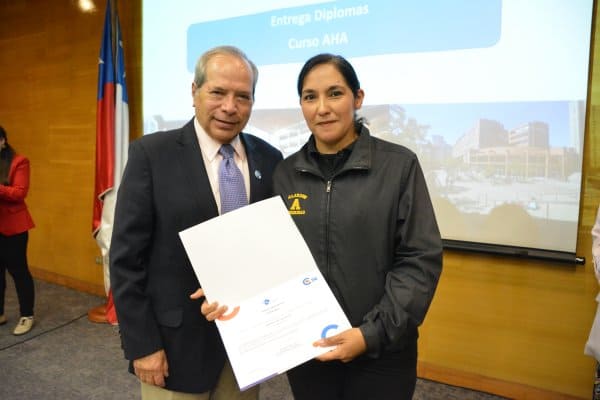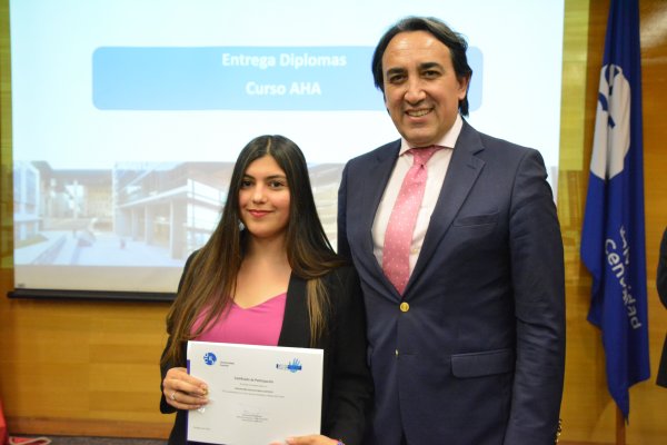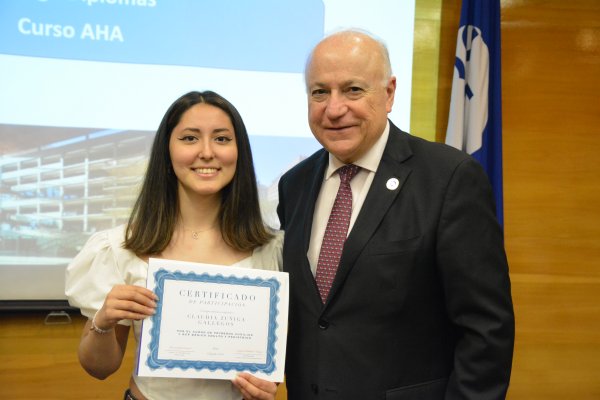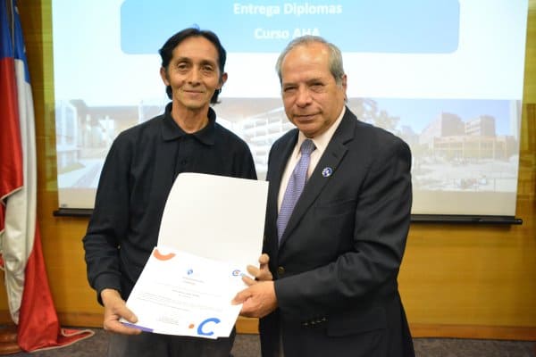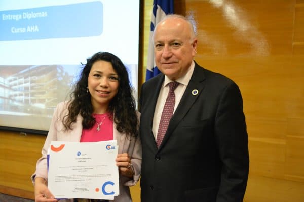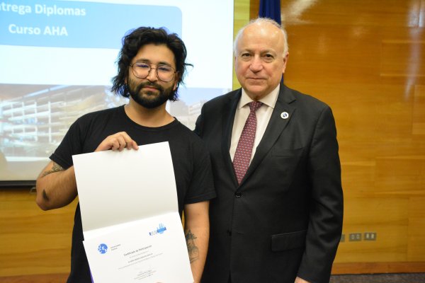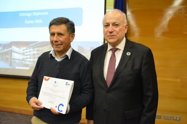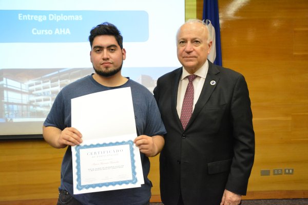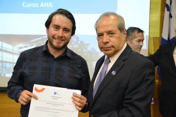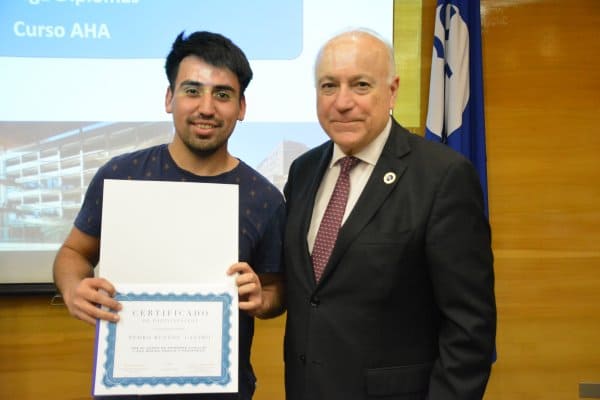 A continuación, el rector Santiago González, junto al vicerrector académico, Emilio Oñate, hicieron entrega de los diplomas a las y los estudiantes que fueron capacitados por el Centro AHA en cursos de primeros auxilios y reanimación cardiopulmonar: