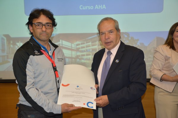 A continuación, el rector Santiago González junto al presidente de la Junta Directiva, Dr. Patricio Silva, entregaron los certificados a los 48 funcionarios que aprobaron la capacitación en cursos de salvacorazones y primeros auxilios AHA 2023: