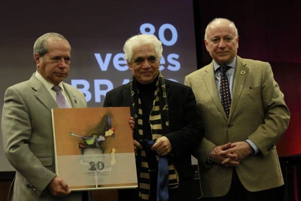 Para finalizar, el pintor y grabador Mario Toral, desde su hogar, envió un saludo muy especial a Roberto Bravo, dedicando de su puño y letra la portadilla del libro de Pablo Neruda «Veinte poemas de amor y una canción desesperada» ilustrado por el mismo Toral, obsequio que el presidente de la Junta Directiva, Dr. Patricio Silva, y el rector Santiago González le entregaron al maestro Bravo para honrar sus 80 años.