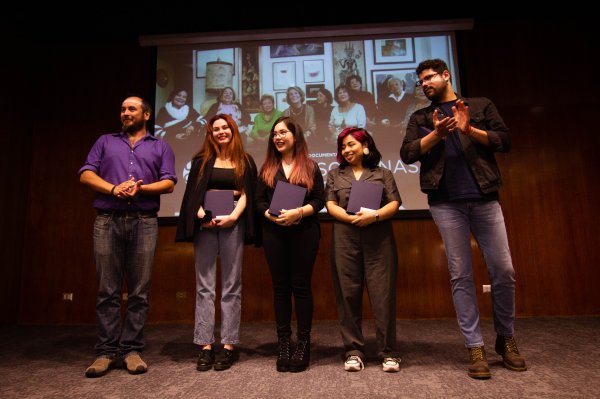 Beas llamó también al escenario al periodista y las periodistas que como estudiantes realizaron el documental para reconocerles su trabajo y dedicación. Los aplausos volvieron a sonar mientras se le entregaba un galardón a Magdalena Rubio, Daniel Achurra, Pía Oliva y Valentina Adones, periodistas de la UCEN, que junto a Scarlett Rost, estuvieron detrás de la cinta lanzada.