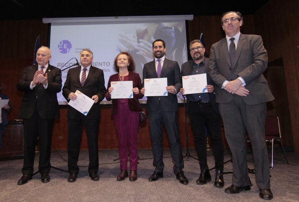 Tras la entrega de certificados a la Facultad de Ingeniería y Arquitectura, el rector Santiago González, junto al decano de la Facultad de Economía, Gobierno y Comunicaciones, profesor Luis Riveros Cornejo, hicieron lo propio con los docentes y estudiantes destacados, reconocimientos que recayeron en: