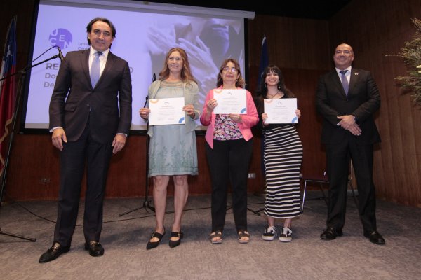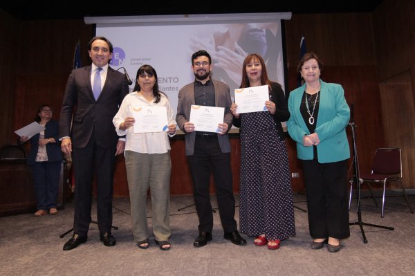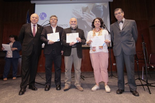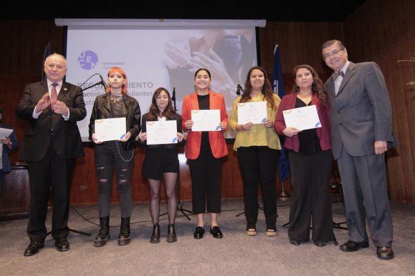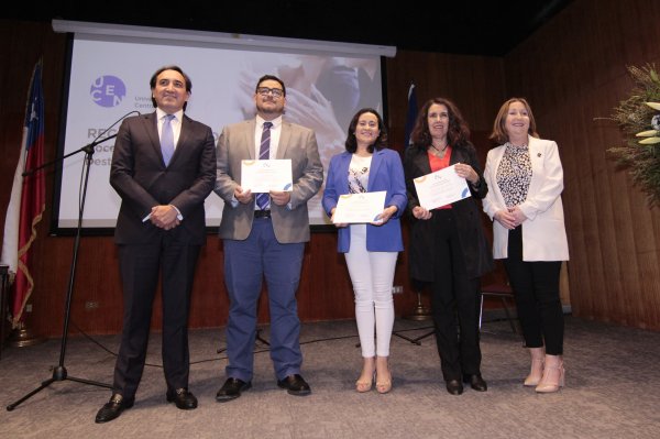 Para continuar con las premiaciones, subió al escenario el vicerrector académico Emilio Oñate Vera y la decana de la Facultad de Educación y Ciencias Sociales, Sonia Fuentes Muñoz, quienes otorgaron los diplomas a: