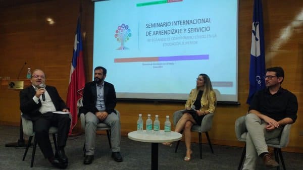 El conversatorio sobre la institucionalización de la metodología A+S, moderado por la misma Claudia Contreras, contó con la participación de Manuel Caire, Jefe del Área Formación para el Compromiso Público del Centro de Desarrollo Docente Pontificia Universidad Católica de Chile y actual Presidente de la Red Nacional de Aprendizaje Servicio Chile (REASE); Jorge Reino, Coordinador Corporativo de Aprendizaje Servicio de la Universidad Autónoma de Chile; y José Ignacio Díaz, Director de Gestión Curricular, Universidad de Las Américas quienes compartieron sus experiencias y visiones sobre la institucionalización de esta metodología en sus respectivas instituciones.