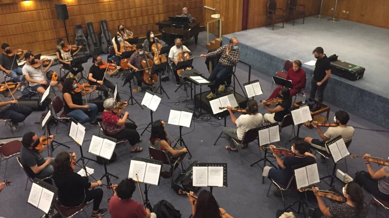 Más de 70 músicos se reunieron en el Aula magna Fundadores del Centro de Extensión Hugo Gálvez Gajardo con motivo de preparar los conciertos que ofrecerá el cantante español en nuestro país.