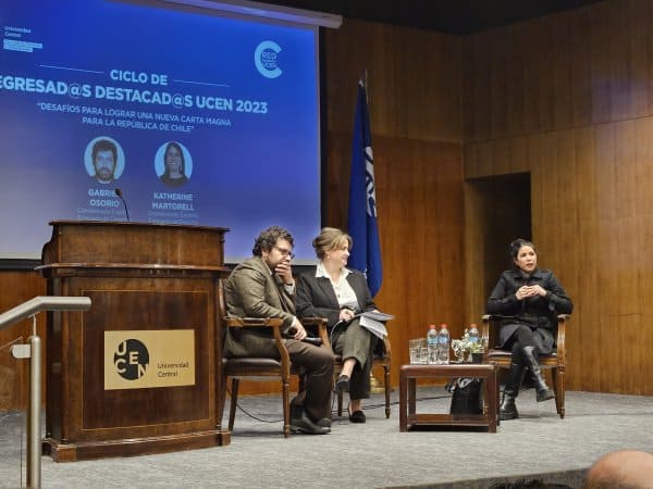 Los abogados centralinos y miembros de la Comisión Experta, Gabriel Osorio y Katherine Martorell, conversaron con la profesora María Angélica Benavides, sobre la importancia del proceso constituyente y su rol en él, especialmente al estar en veredas políticas distintas, pero compartiendo el sello de la Universidad Central.