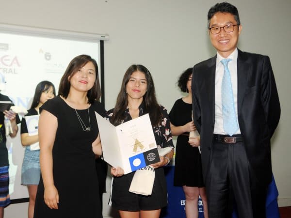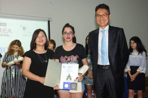 Desafortunadamente, la profesora del Instituto Rey Sejong Santiago no pudo estar presente, pero envío un video de felicitaciones a todos los estudiantes que lograron aprobar sus respectivos cursos. Macarena Alvarado, ganadora del Concurso de Oratoria, contó su experiencia en el viaje al programa “Experiencia Cultural y Académica en Corea para estudiantes sobresalientes de Instituto Rey Sejong” y motivó a los estudiantes a participar en el concurso destacando que el aprendizaje logrado es incalculable.