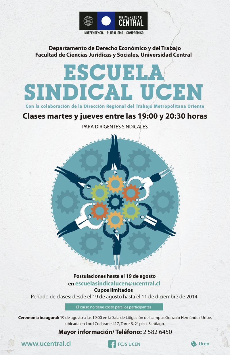 Los interesados en participar, pueden inscribirse hasta el 19 de agosto escribiendo al correo electrónico escuelasindicalucen@ucentral.cl Para mayor información, comunicarse con la secretaria Teresa González al teléfono 25826450 (cupos limitados).