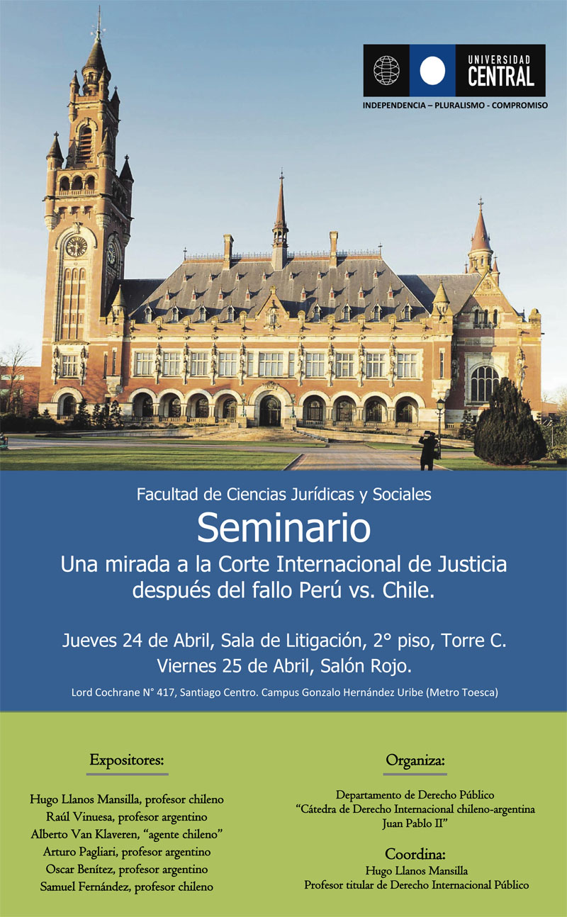 Dos intensas jornadas de reflexión sobre los procesos y criterios actuales de resolución de conflictos en La Haya se vivirán la próxima semana con la celebración del seminario "Una Mirada a la Corte Internacional de Justicia (CIJ) Después del fallo Perú vs Chile", evento que organiza el Departamento de Derecho Público.