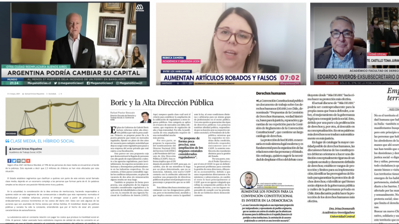 En la carrera de Derecho los profesores Samuel Fernández, Silvio Cuneo, José Ignacio Núñez, Edgardo Riveros, Emilio Oñate y Alejandro Usen tuvieron el mayor número de presencia en medios, en un año marcado por la Convención Constitucional y las noticias internacionales. Las académicas que más aparecieron en prensa fueron Rebeca Zamora, Paola Tapia, Isabel González y Mylene Valenzuela. En el caso de Trabajo Social, destacó la presencia de los docentes Hugo Covarrubias y Samuel Erices, y de las profesoras Ana María Galdames, Magaly Garrido y Herminia Gonzalvez.