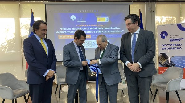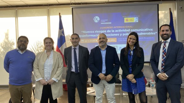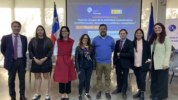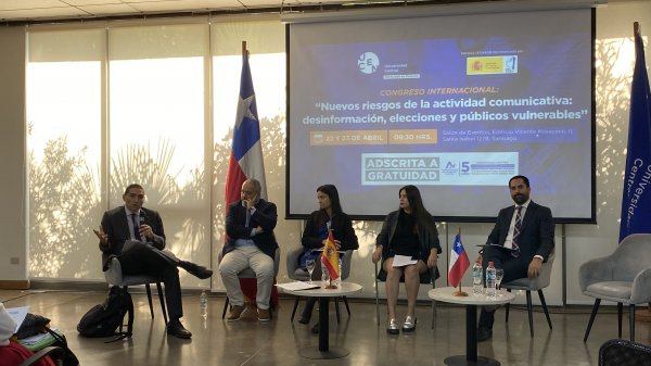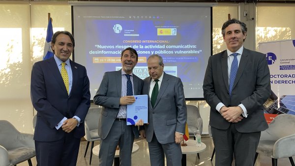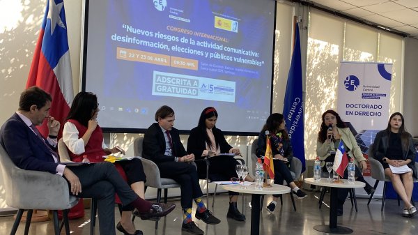 El 22 y 23 de abril en el Salón de Eventos del Campus Vicente Kovacevic II se reunieron expertos chilenos y españoles en el congreso “Nuevos riesgos de la actividad comunicativa: desinformación, elecciones y públicos vulnerables”. El encuentro, que fue organizado por el Doctorado en Derecho UCentral y el Observatorio Complutense de Desinformación de la Universidad Complutense de Madrid, comenzó con la conferencia inaugural a cargo del profesor de la Universidad CEU San Pablo, Leopoldo Abad Alcalá.