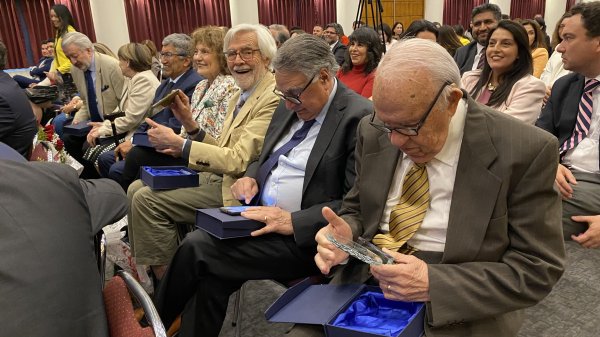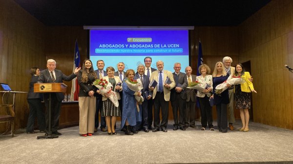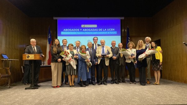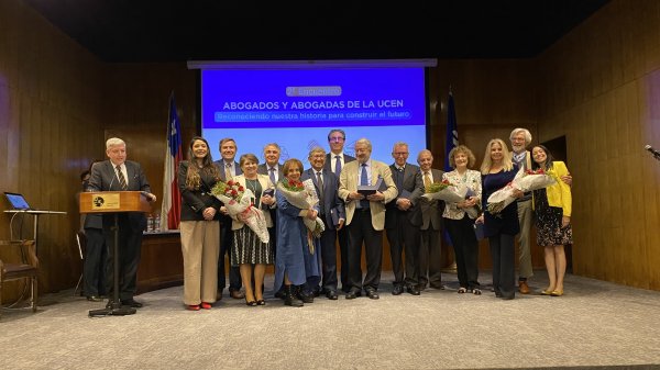 El 16 de octubre se celebra el Chile el Día del Profesor. En ese contexto, un momento emotivo del evento fue el homenaje a 11 docentes que han dedicado décadas a la formación de abogados/as centralinos/as. Este reconocimiento público resaltó la trayectoria y compromiso de quienes han sido parte fundamental de la historia de la Facultad: Bracey Wilson Volochinsky (desde 1983); Edgardo Riveros Marín (desde 1984, con algunas interrupciones); Neville Blanc Renard (desde 1985); Fidel Reyes Castillo (ingresó en 1985 y fue el primer Decano, volvió el año pasado a hacer clases); Patricia Muñoz Valdés (desde 1989, fue la única que no pudo asistir por situaciones personales); María Victoria Valencia Mercaido (desde 1991); Isabel González Ramírez (desde 1992); Óscar Torres Sagal (el primer abogado centralino es también profesor desde 1994); María Alejandra Rojas (también centralina, la jueza comenzó haciendo ayudantías desde su segundo año de carrera. En 1995 se convirtió en profesora titular); Ministra Dobra Lusic Nadal (desde 1996) y el profesor Ricardo Núñez Sandoval (quien nos acompaña desde 1998).
