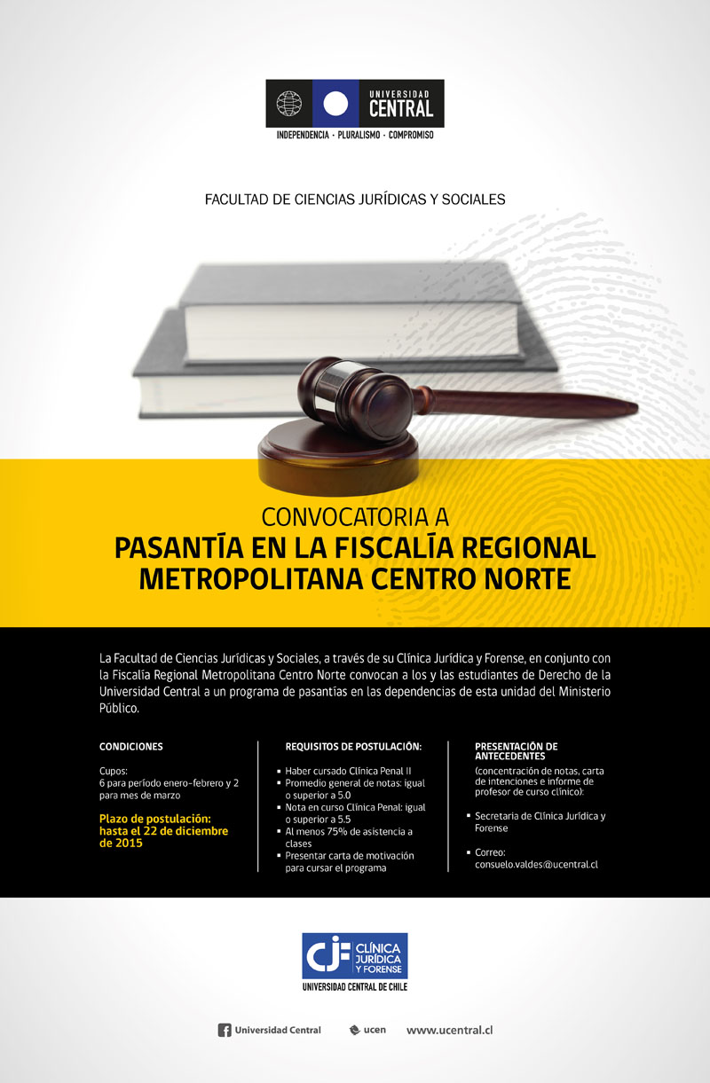 En el marco de este convenio, la Fiscalía Regional Metropolitana Centro Norte y la Clínica Jurídica y Forense de la Universidad Central abrieron una primera convocatoria a pasantía para desempeñarse en esta unidad del Ministerio Público para los períodos enero-febrero o febrero-marzo de 2015.
