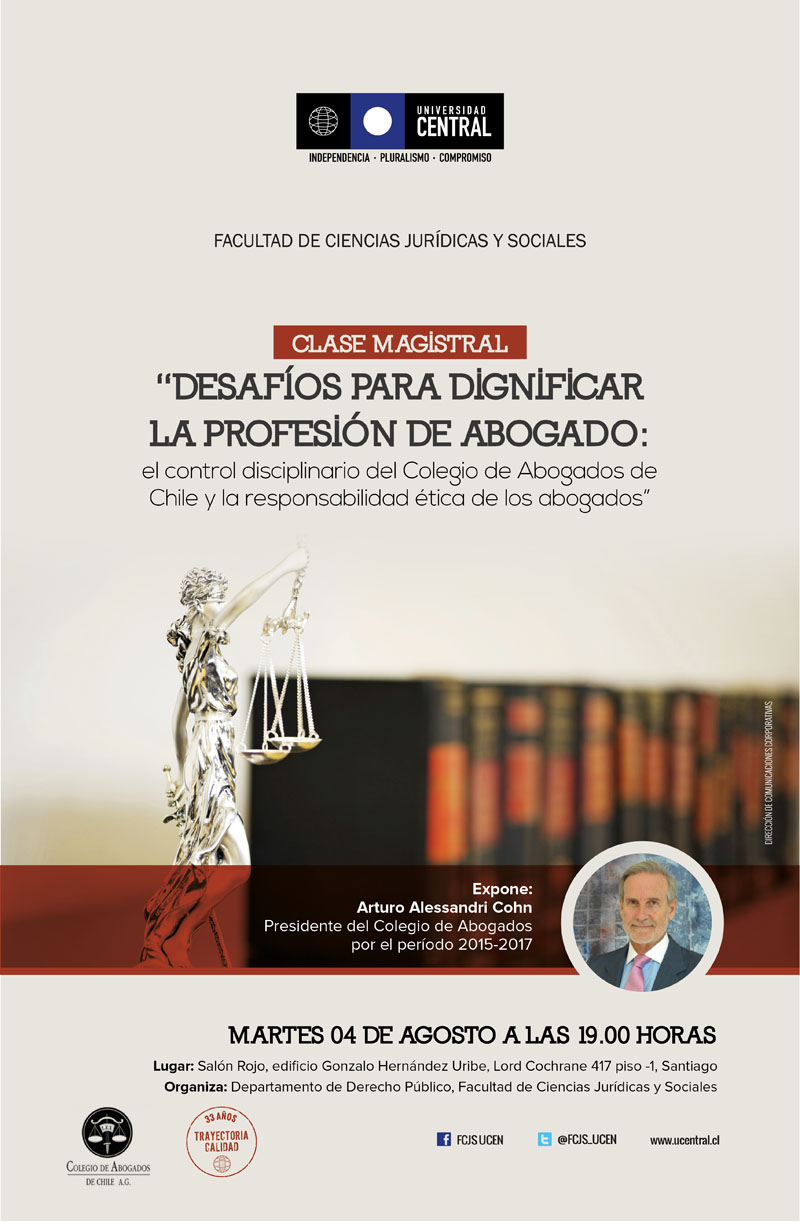 El próximo martes 4 de agosto la Facultad de Ciencias Jurídicas y Sociales de la Universidad Central de Chile (FCJS) será distinguida con la honorable visita del nuevo presidente del Colegio de Abogados de Chile, don Arturo Alessandri Cohn, quien impartirá una clase magistral a nuestra comunidad universitaria titulada "Desafíos para dignificar la profesión de abogado: el control disciplinario del Colegio de Abogados de Chile y la responsabilidad ética de los abogados".
