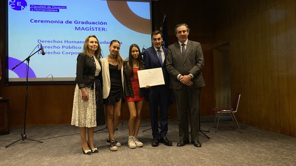 Al finalizar la ceremonia se vivió la emotiva entrega de títulos póstumos. Félix Navarro recibió el diploma de Magíster en Derechos Humanos de su esposa, Camila Krautz. Mientras que Valentina e Isidora Castro, junto a su tío Cristián, recibieron el título de Magíster en Derecho Corporativo de su padre Marcelo Castro Durán.