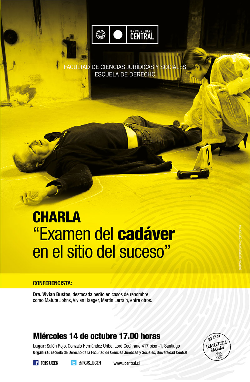 La prestigiosa médico legista y criminalista tanatóloga del Servicio Médico Legal de Santiago, doctora Vivian Bustos, ofrecerá una interesante charla sobre medicina legal titulada "Examen del cadáver en el sitio del suceso". En la actividad, la reconocida profesional y docente de la Facultad de Ciencias Jurídicas y Sociales de la Universidad Central de Chile, compartirá su nutrida experiencia en labores de peritaje al servicio de las diversas investigaciones penales en las que ha participado.