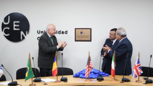Por su parte, el decano de la Facultad de Derecho y Humanidades, Rafael Pastor Besoain, valoró el sentido profundo de este homenaje: “no es cualquier sala. Es la sala de la Dirección de Relaciones Internacionales, que evidentemente permite una coherencia perfecta entre lo que fue el desarrollo académico y profesional del profesor Hugo Llanos en el país, pero también en la Universidad Central. Creo que es muy importante para la universidad como una institución que aspira a la duración y a la permanencia, que sus docentes queden inmortalizados, especialmente cuando tienen el mérito para ello en estos edificios”.