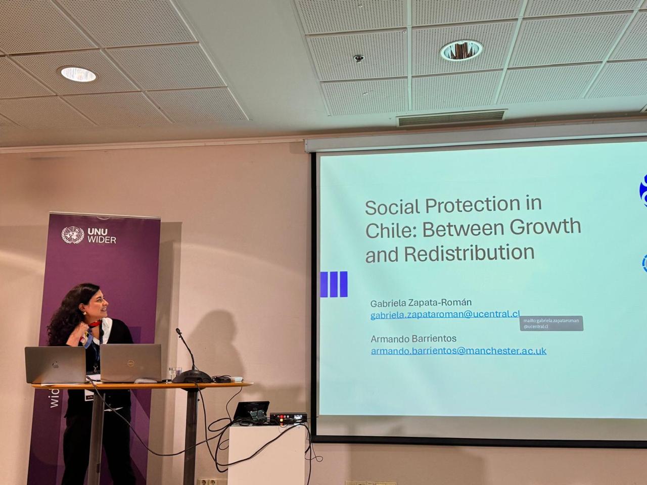 En este espacio, la académica Gabriela Zapata-Román, investigadora del Centro de Investigación en Economía y Sociedad y Académica de la Facultad de Economía, Gobierno y Comunicaciones de la Universidad Central, presentó los hallazgos preliminares de una investigación que realiza junto al profesor Armando Barrientos de la Universidad de Manchester. El estudio, centrado en el sistema chileno de protección social, forma parte de un análisis comparado sobre seguridad social en el sur global.
