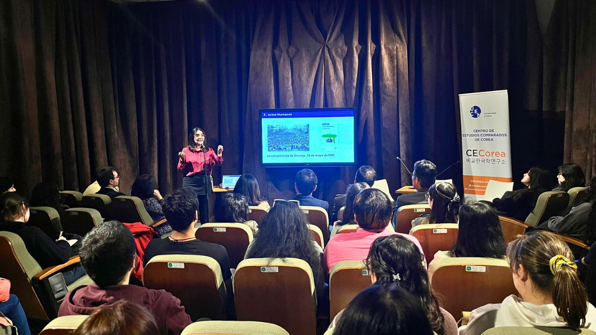 Posteriormente, fue el turno de Valentina Figueroa, coordinadora académica del Instituto Rey Sejong Santiago y también graduada del Magíster en Estudios Coreanos, quien presentó “Han Kang, lecturas desde Chile para un encuentro desde el Sur”. La presentación propuso claves para un acercamiento comparado y decolonial a las novelas Actos Humanos e Imposible decir adiós.