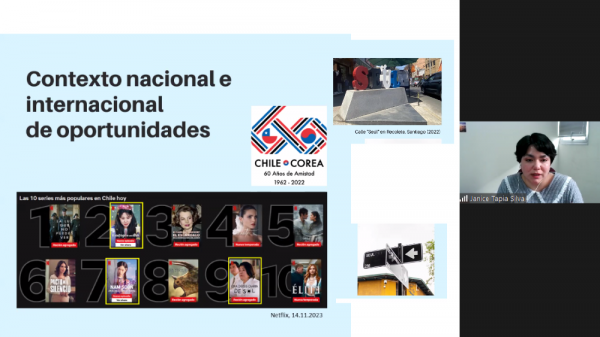 Por su parte, la doctoranda Janice Tapia Silva participó de manera online con la ponencia “El poder blando del hallyu desde el accionar cotidiano del fandom”. En la presentación se propuso un enfoque microsociológico con la figura del fan en su centro, con el fin de complementar y discutir con la mirada industrial sobre el hallyu, la cual ha sopesado sus efectos económicos y geopolíticos. A través de un “giro” hacia el fandom, se propuso complejizar una suposición pasiva del fan como mero receptor de las estrategias de la industria, para indagar en el potencial político de sus prácticas afectivas.