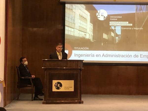 Riveros también se refirió a la especial coyuntura económica, política y social que se constituye en el escenario en que deberán actuar los nuevos egresados y egresadas de la UCEN, señalando que “estamos enfrentando más incertidumbre, más riesgos, una economía global con severas complicaciones y eso afecta en las decisiones de las empresas, por pequeña, mediana o grande que sea, entonces, hoy se requiere de ustedes competencias muy actualizadas en materias de riesgo financiero, economía internacional, manejo de personas (…) pero ustedes ya están probados y eso es lo que certifica ese diploma que tienen en sus manos”.