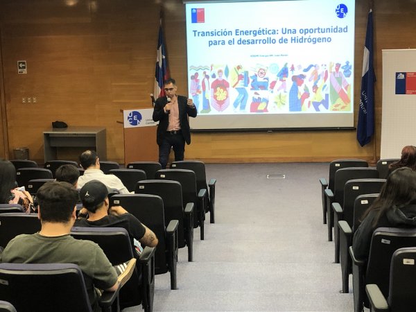 Hasta el auditorio Carlos Blin del campus Vicente Kovacevic II, llegaron los estudiantes de la carrera a escuchar los planteamientos de la autoridad regional, cuya exposición fue introducida por el director Luis Martínez Cerna quien a su vez agradeció su disposición para “contarnos las grandes oportunidades de desarrollo, particularmente en la transición a energías más limpias”.