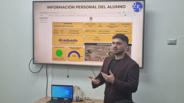 Durante la jornada, Matías presentó el proyecto que desarrolló junto a su compañero Cristián Donoso como parte de su trabajo de titulación: un completo dashboard en Power BI que permite hacer seguimiento al rendimiento académico de los estudiantes durante su paso por la universidad. La herramienta permite visualizar calificaciones, evolución por semestre, desempeño por asignatura, datos demográficos, segmentación por género y ubicación geográfica, entre otras variables, entregando información clave para la toma de decisiones de los principales KPIs institucionales.