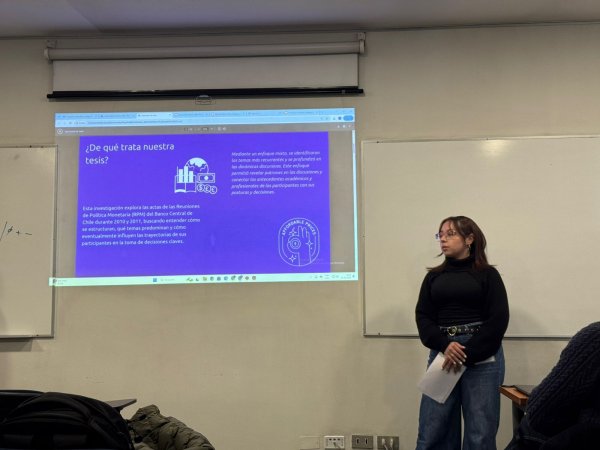 Uno de los momentos destacados de la jornada fue la participación estudiantil. Francesca Araya y Benjamín Gatica, estudiantes de Sociología de la Universidad Central, presentaron su investigación: “Banco Central de Chile: la relevancia e implicancia de sus actas de política monetaria”. En la instancia también expusieron los académicos de nuestra Universidad, Matías Gómez y Nicolás Delgado quienes presentaron sus trabajos vinculados a redes de influencia y política monetaria en América Latina.