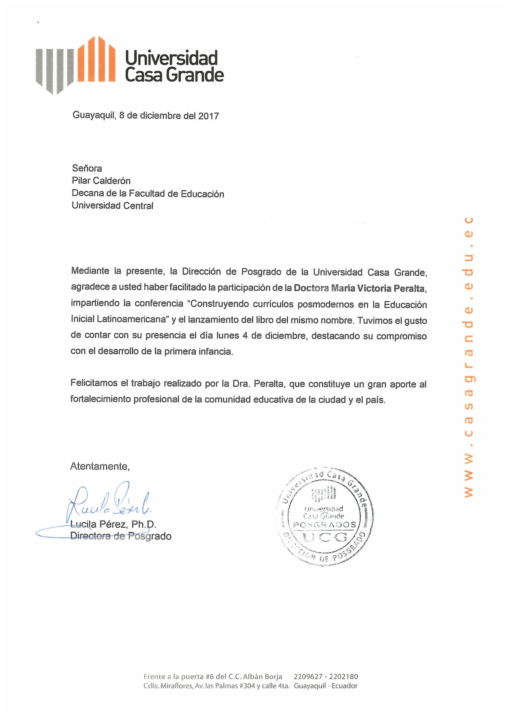 El pasado lunes 4 de diciembre, la directora del Instituto Internacional de Educación Infantil (IIDEI), doctora María Victoria Peralta, presentó en la Universidad ecuatoriana Casa Grande, la charla magistral titulada "Construyendo currículos posmodernos en la Educación Inicial Latinoamericana".