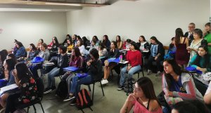 Posteriormente la actividad contó con un breve ejercicio de lengua de señas a cargo de los profesores Enrique Gutiérrez y Rodrigo Sanhueza, con el apoyo en la interpretación de dos estudiantes de cuarto y quinto año respectivamente, lo cual resultó muy motivador y con una gran participación por parte de las nuevas estudiantes.