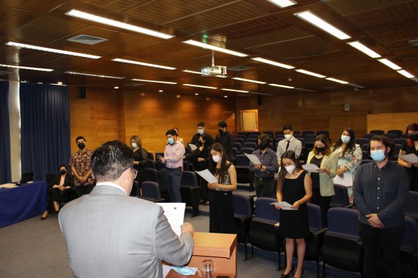 Las palabras de bienvenida estuvieron a cargo de la Decana de la Facultad, quien reconoció el esfuerzo de los estudiantes y sus familias, valorando además la espera para esta ceremonia que se vio aplazada por las restricciones impuestas por la pandemia del Coronavirus.
