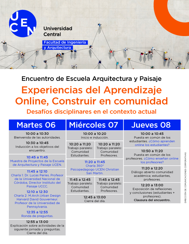 La actividad contempla distintas actividades que promueven el diálogo, análisis y reflexiones sobre las experiencias y resultados obtenidos durante el año académico 2020. Además, contará con la participación de invitados especiales quienes compartirán sus perspectivas y aprendizajes aplicados en otras instituciones de educación superior fuera de Chile: Dr. Lucas Peries, profesor de la Universidad Nacional de Córdoba (Argentina) y director del Instituto del Paisaje UCCC; David Gouverneur, profesor de la Universidad de Pennsylvania (EE.UU); Christian San Martín, Psicopedagogo UCEN.
