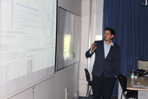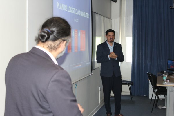 Ante estudiantes de Ingeniería Civil Industrial de distintos años y asignaturas, Pablo Pedraza, estudiante del Magíster en Ingeniería Industrial y miembro del Programa de Desarrollo Logístico del Ministerio de Transportes y Telecomunicaciones, expuso sobre el "Plan de Logística Colaborativa: Una herramienta de facilitación del corto plazo".